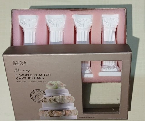 Set of4 White Plaster M&S Luxury Cake Pillars & 4 Plastic Dowelling Rods, Boxed.