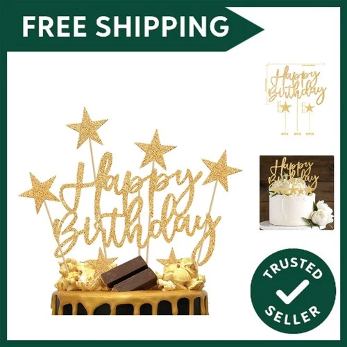 2 Sets Gold Cake Decoration Happy Birthday Banner Confetti Balloon Stars Hear...