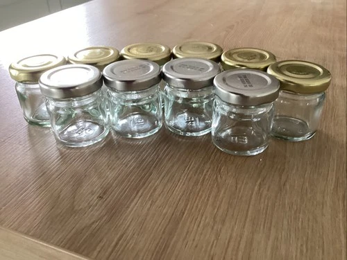 10 x EMPTY GLASS MINI JAM JARS, SILVER & GOLD LIDS, 5cm.