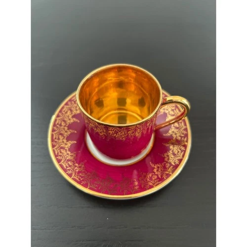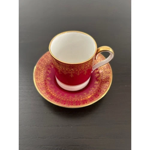 Vintage Cranberry Red and Gold Filigree Demitasse Espresso Cup and Saucer Set