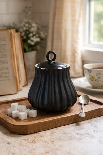Country Cottage Ceramic Sugar Bowl Black Ribbed Farmhouse Cottagecore