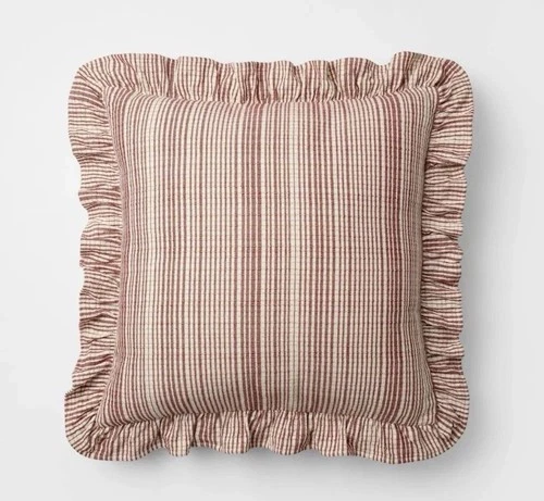 24"x24" Uneven Plaid with Ruffle Pillow Burgundy/Cream - Threshold Studio McGee