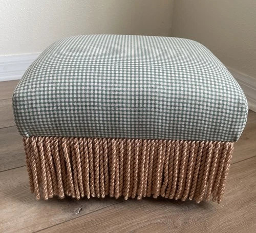 Wooden Ottoman Green/White Gingham Upholstered w/ Tassel Fringe Skirt Foot Stool
