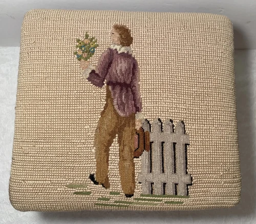 Handmade Needlework Foot Stool Courting Gentleman With Flowers At Gate