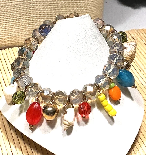 Fashion Bracelet Multi Color Plastic & Glass Charms Gold Tone Stretch Lot 97C