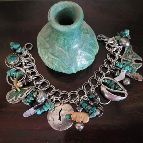 Vintage Native CHARM BRACELET Sterling Silver Charms Turquiose Fetishes Signed
