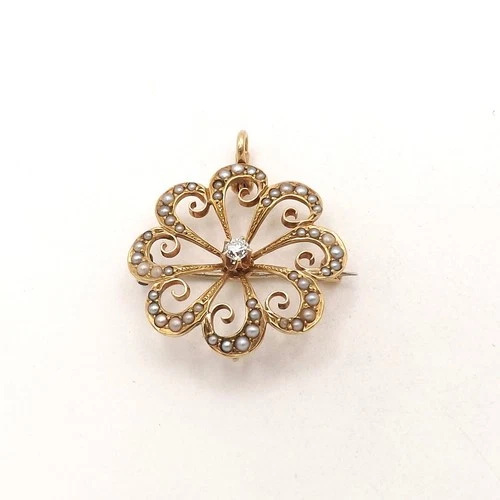 Art Nouveau Solid 14k Gold Seed Pearl Mine Cut Diamond Brooch Pendant Setting