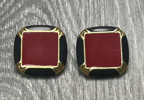 Monet Earrings Square Red Black Enamel Gold Tone Signed Pair - NO BACKS