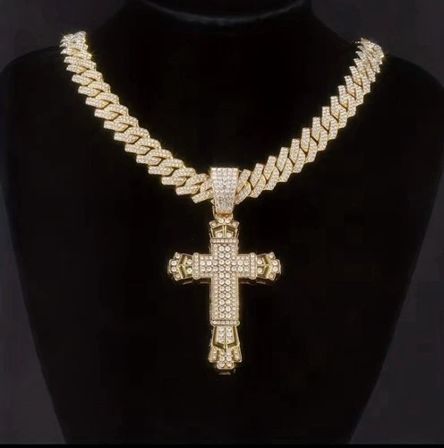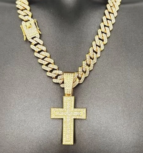 Men's Golden Plated Cuban Link Chain Cross Pendant Necklace Cubic Zirconia
