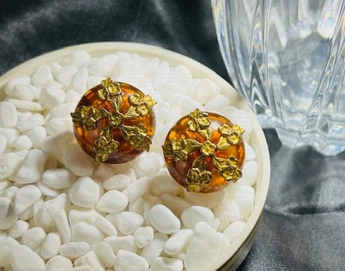 VTG Miriam Haskell Signed Faux Amber Lucite Round Clip Earrings Floral Motifs
