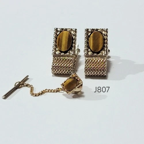 VTG 1960s Gold Tone Mesh Wrap Cufflinks and Tigers Eye Tie Tack Set