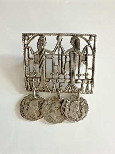 Egyptian Ladies Pin Brooch Silver Tone Coins Dangle Toasting Each Other Antique