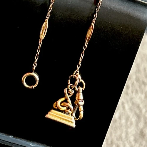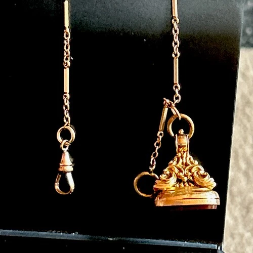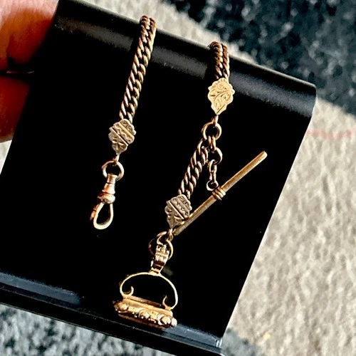 Victorian H&H Rose Gold Fill 12” Watch Chain TBar GF Carnelian Fob Monogram 31g