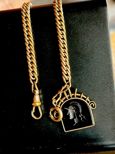 Victorian Rose Gold Fill Intaglio Sard Carved Warrior Arch Fob Rose GF Chain 21g