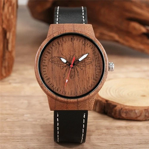Handmade Bee Design Men's Wooden Quartz Watch Leather Band Luminous Hands Gift