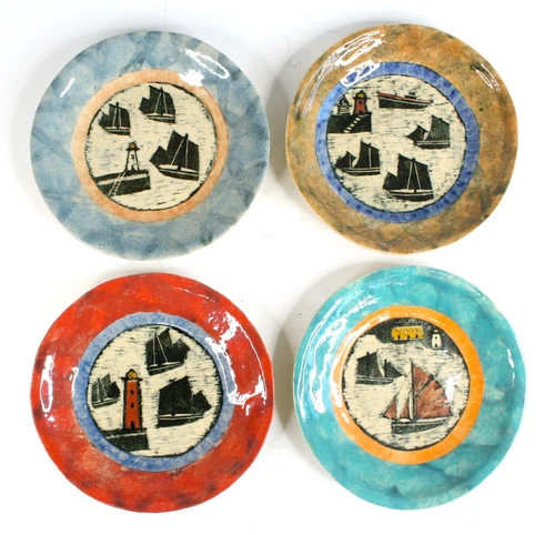 Robina Jack Pottery Plates 'Wallis'. Set of four. Coastal / Sailing. D 20.7cm