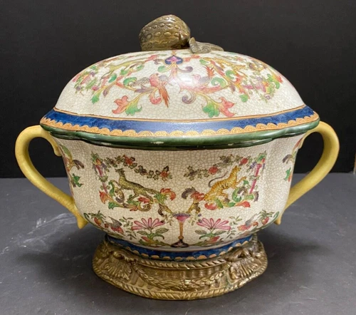 Crackle Glazed COVERED POT Brass Mounted Wild Animals Exotic Birds Asian Handled