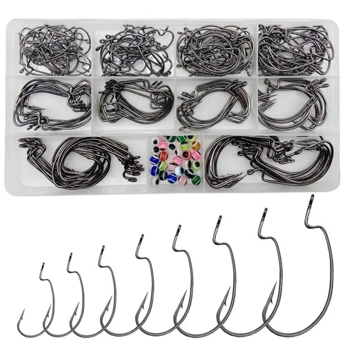 DAMIDEL 220Pcs/Box 2X Strong High Carbon Steel Worm Fishing Hook,8 Sizes Mixe...