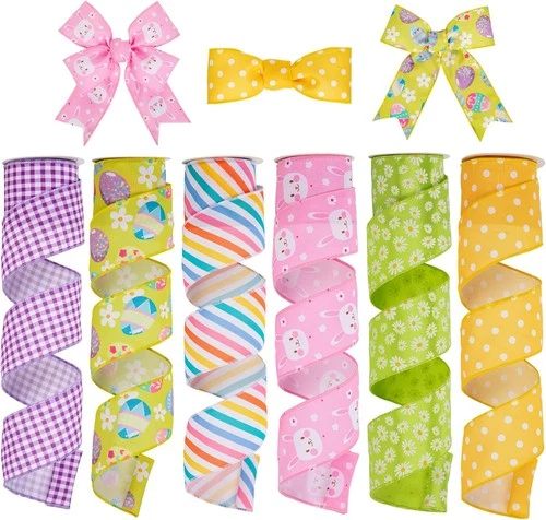 Oairse 6 Rolls Easter Ribbon 6.3cm 30Yard Wired Ribbon Set with Bunny Easter Egg