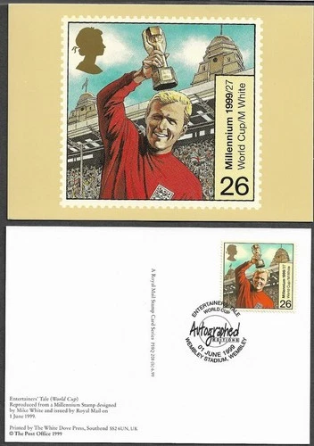BOBBY MOORE ENGLAND 1966 FOOTBALLER WORLD CUP POSTCARD + STAMP 1999 ROYAL MAIL