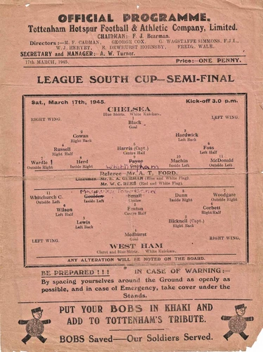 War Cup Semi Final South 17th March 1945 Chelsea v West Ham United @ Tottenham