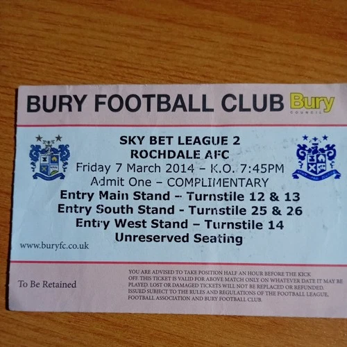 Ticket : 2013/2014 7/3/2014 League 2 Bury v Rochdale AFC