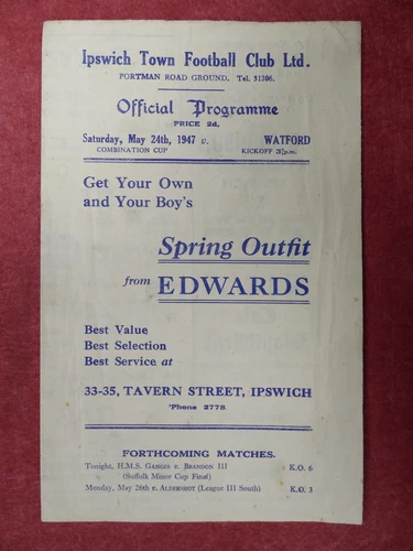 IPSWICH TOWN v WATFORD | 1946/1947 | RESERVES | 24 MAY 1947 | UK FREEPOST