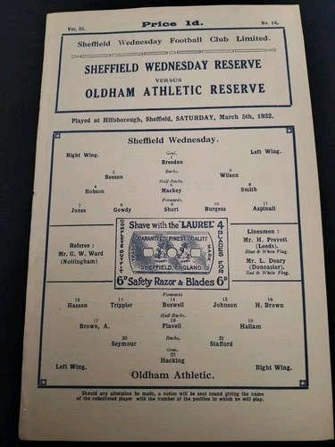 RARE PRE WAR PROGRAMME SHEFFIELD WEDNESDAY V OLDHAM ATHLETIC RESERVES 1931/32