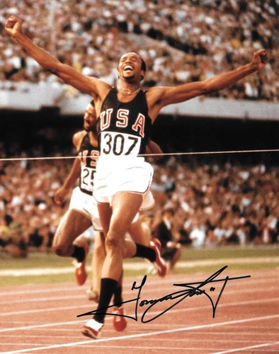 tommie smith beams with delight after winning gold 200m 1968 signed 10x8 photo