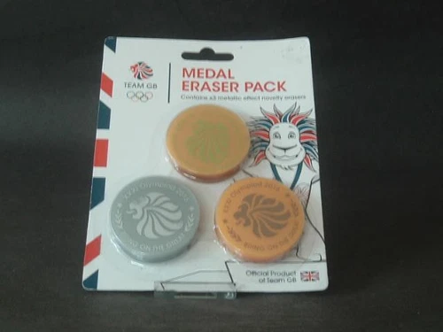 Team GB Medal Erase Pack - x3 metallic effect novelty erasers 2016 unopened pack