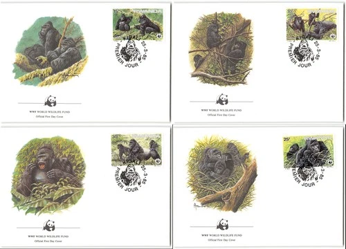 Rwanda #1208-11 Four WWF FDC's, gorilla stamps & cachets, panda logo, 1985