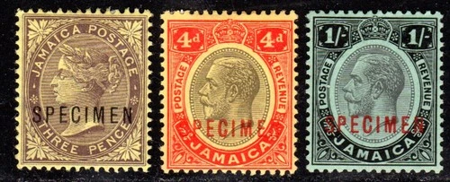 Jamaica 52, 63, 65, unused 3+4d and 1 Sh. each with Specimen overprint