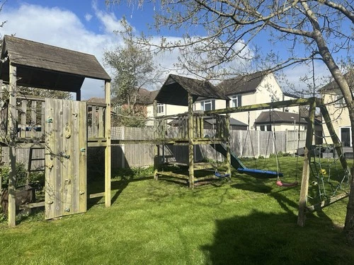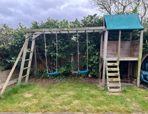 Dumpster House Squirrel Fort Climbing frame with double swing set and slide