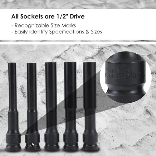 1/2 Inch Drive Extra Deep Impact Socket Set 5 Pcs Extra Long Thin Wall Metric 8