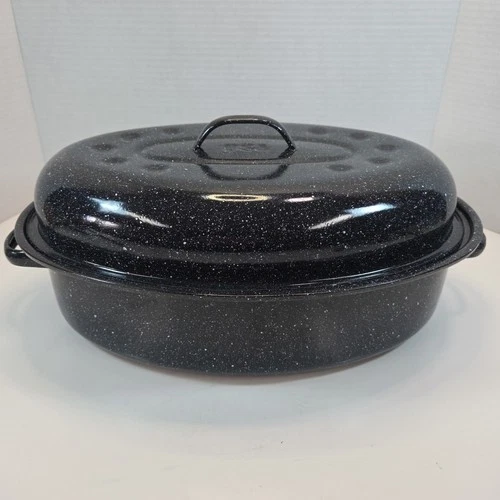 Vintage Black Speckled Enamel Oval Roasting Pan with Lid 14'x10" Enamelware USA