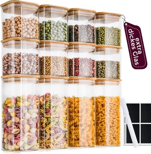 12x Glass Storage Jars Square 400/920ml with Bamboo Lids Airtight