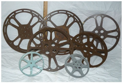 Lot of 7 Metal 16mm/18mm 2000 1600 1200 ft Film Reels Goldberg Brothers + others