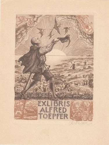 Exlibris Bookplate Radierung Karl Ritter 1888-1977 Wanderer Windmühlen Ernte
