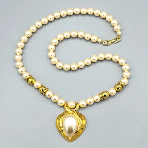 1990s Napier Gold Tone Faux Pearl Bead Twist Heart Necklace 24"