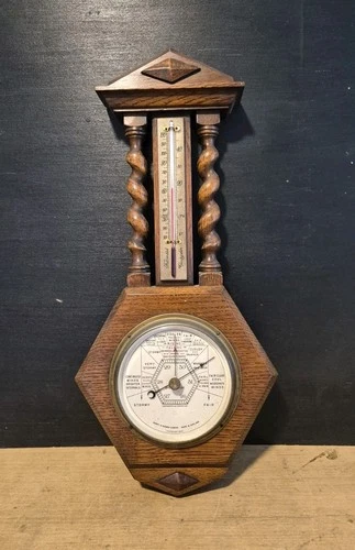 VINTAGE SOLID OAK AND BRASS SHORT & MASON BAROMETER THERMOMETER OAK BARLEYTWIST