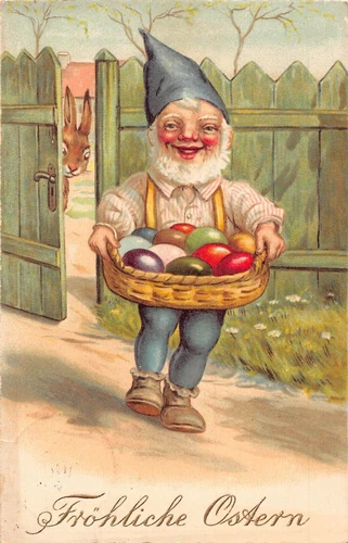 L394 Easter Greetings 1929 dwarf basket eggs rabbit vintage postcard