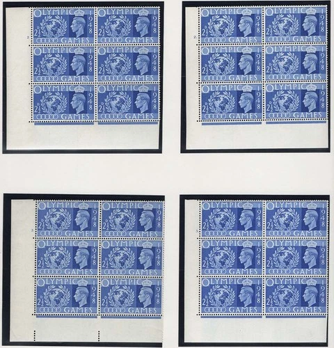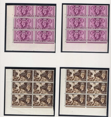 GB 1948 Olympics 6d cyl 2 and 2 dot corner blks of 6 f mint, ditto 1s 3 and 3 d