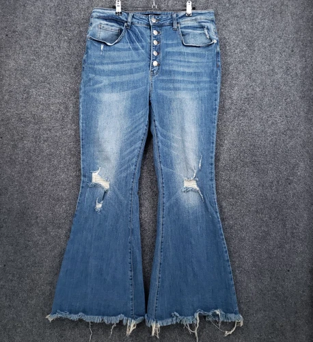 Risen Paisley Jeans Womens 1XL Plus Blue Distressed High Rise Button Fly Raw Hem