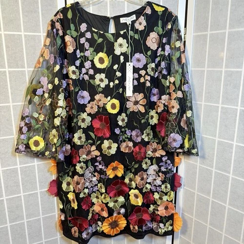 She + Sky Dress Womens 1XL Black Floral Applique Boho Cottagecore Colorful