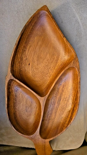 MCM Vintage Carved Monkey Pod Wooden Leaf-Shaped Sectioned Tray, 16.5" Luau/Tiki
