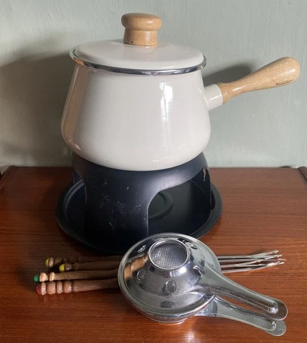 Airedale Porcelain Enamel Cream Fondue Set 4 Forks Boxed Vintage 1970s Retro