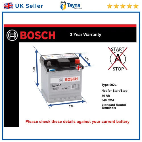 Battery fits BMW i3 2013 on Bosch 002L 340A 40Ah 3Yr Warranty 175x175x190 New