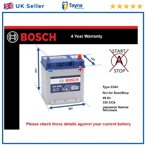 Battery fits TOYOTA PRIUS ZVW4 1.8 2011 on Bosch 054H 330A 40Ah 4Yr Warranty New