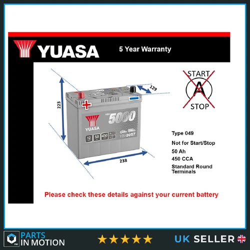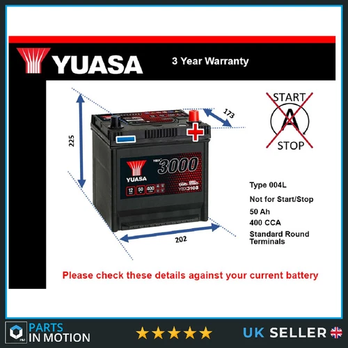 Battery fits MITSUBISHI LANCER 1.3 03 to 13 Yuasa 004L 400A 50Ah 3Yr Warranty
