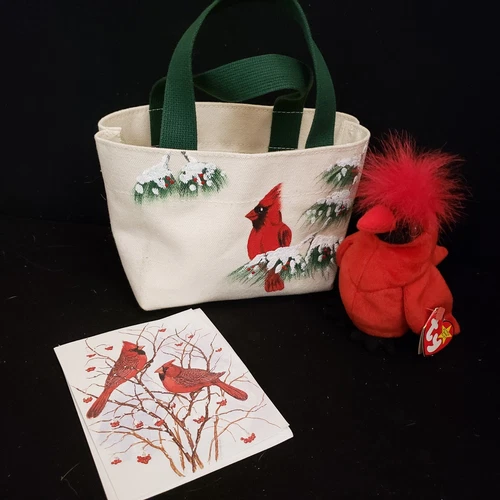 Red Handpainted Cardinal Tote Bag Canvas Christmas Bird Ty Beanie Baby and Card